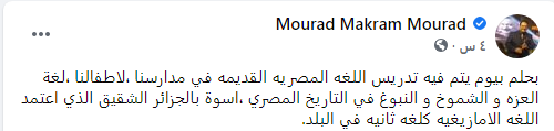 وكتب مراد مكرم عبر حسابه الشخصي بموقع التواصل الاجتماعي فيس بوك: بحلم بيوم يتم فيه تدريس اللغة المصرية القديمة في مدارسنا، لغة العزة والشموخ والنبوغ في التاريخ المصري، اسوة بالجزائر الشقيق الذي اعتمد اللغة الامازيغية كلغة ثانية في البلد.