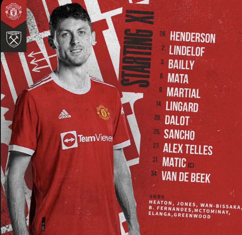 وجاء تشكيل فريق مانشتسر يونايتد لمواجهة فريق وست هام يونايتد كالأتي:-
