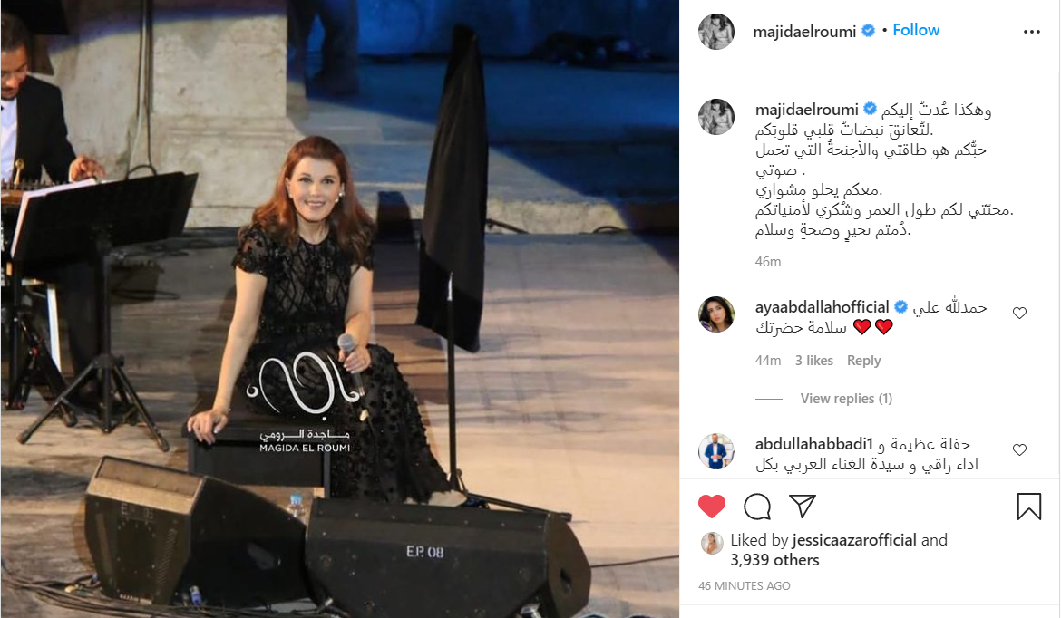 نشرت ماجدة الرومي صورة لها، وهى جالسة على المسرح، عبر صفحتها الرسمية على موقع انستجرام، وكتبت عليها قائلة: وهكذا عُدت إليكم، لتُعانق نبضات قلبي قلوبكم.. حبكم هو طاقتي والأجنحة التي تحمل صوتتي.