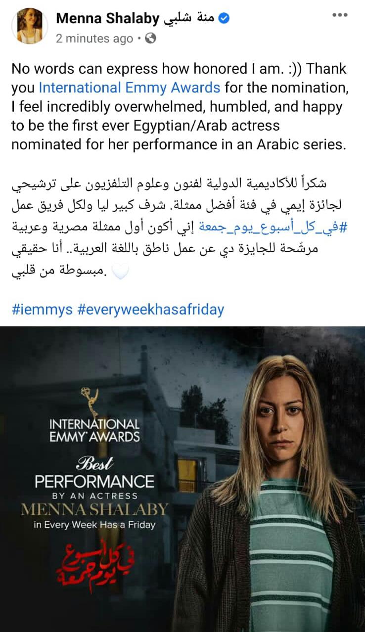 نشرت الفنانة منة شلبي بوستر مسلسلها كل أسبوع يوم جمعة، عبر صفحتها الرسمية على موقع فيس بوك، وكتبت عليه قائلة: شكرًا للأكاديمية الدولية لفنون وعلوم التليفزيون على ترشيحي لجائزة إيمي في أفضل ممثلة.. شرف ليا ولكل فريق عمل في كل أسبوع يوم جمعة إني أكون أول ممثلة مصرية وعربية مرشحة للجايزة دي عمل ناطق باللغة العربية.. أنا حقيقي مبسوطة من قلبي.