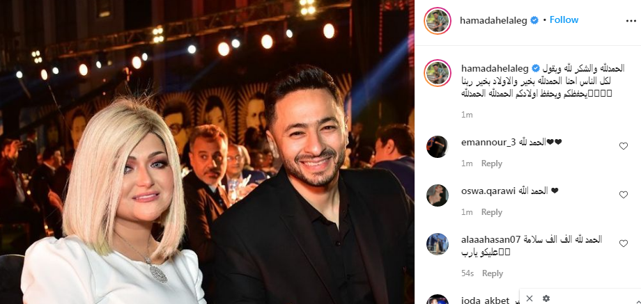 نشر حمادة هلال صورة له، مع زوجته، عبر حسابه الشخصي بموقع تبادل الصور والفيديوهات القصيرة إنستجرام، وعلق عليها قائلًا: الحمد والشكر لله، وبقول لكل الناس إحنا الحمد لله بخير، والأولاد بخير، ربنا يحفظكم ويفظ أولادكم.. الحمد لله.. الحمد لله.
