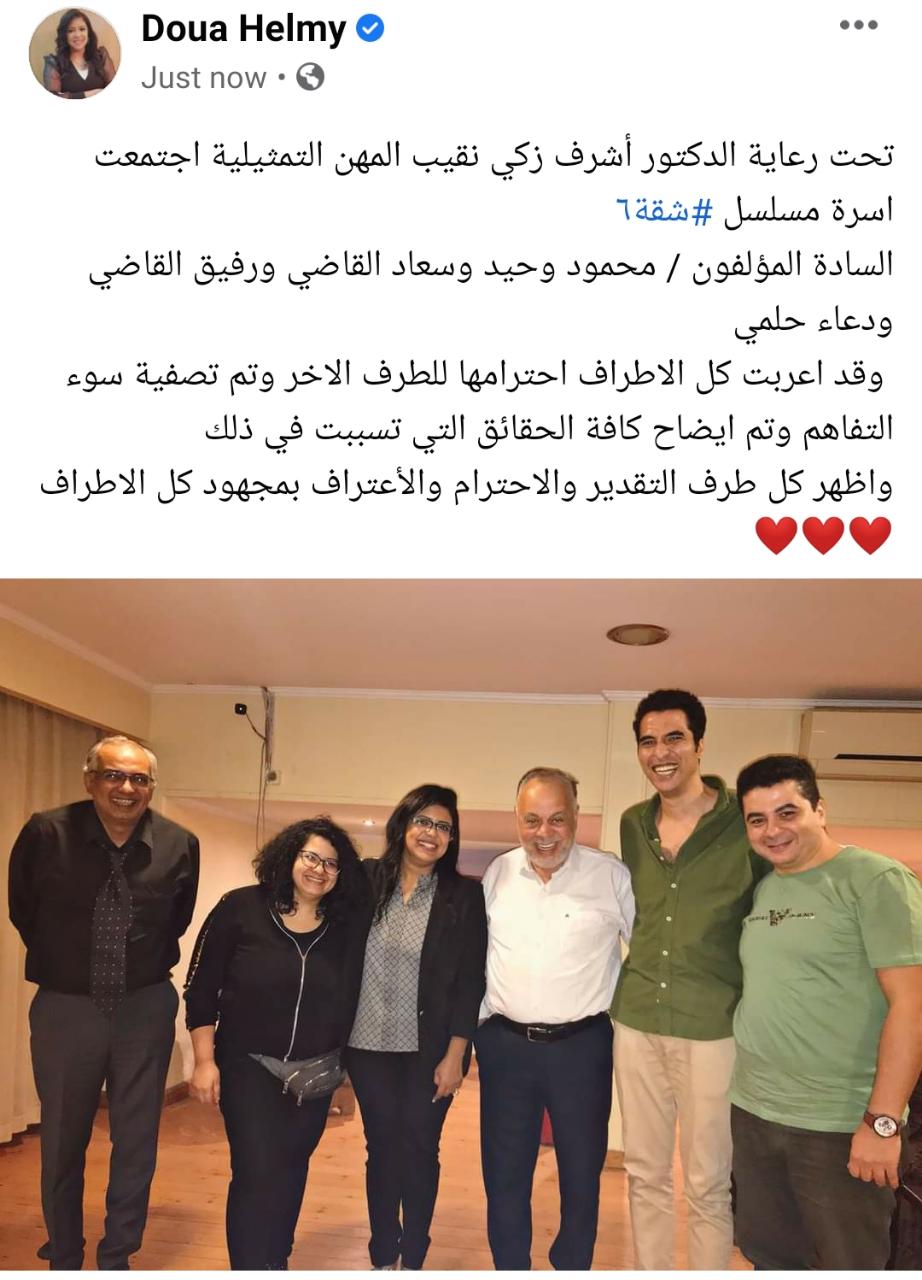 وكتبت دعاء حلمي منشورًا، عبر حسابها الشخصي بموقع الواصل الاجتماعي فيس بوك، جاء فيه: تحت رعاية الدكتور أشرف زكي، نقيب المهن التمثيلية، اجتمعت أسرة مسلسل شقة 6، السادة المؤلفون محمود وحيد، سعاد القاضي، رفيق القاضي، ودعاء حلمي.