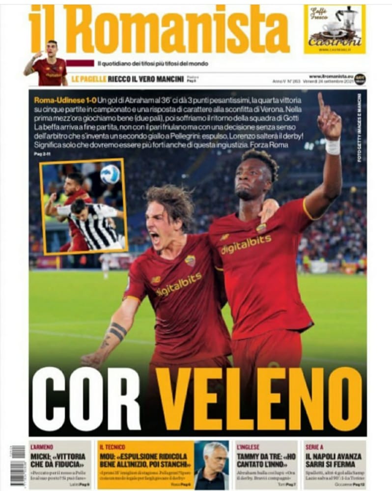 سلطت صحيفة رومانيستا الإيطالية في عددها الصادر اليوم الجمعة، الضوء على فوز روما على أودينيزي، في صفحة الغلاف تحت عنوان السموم.. فوز روما رغم الطرد الغريب.
