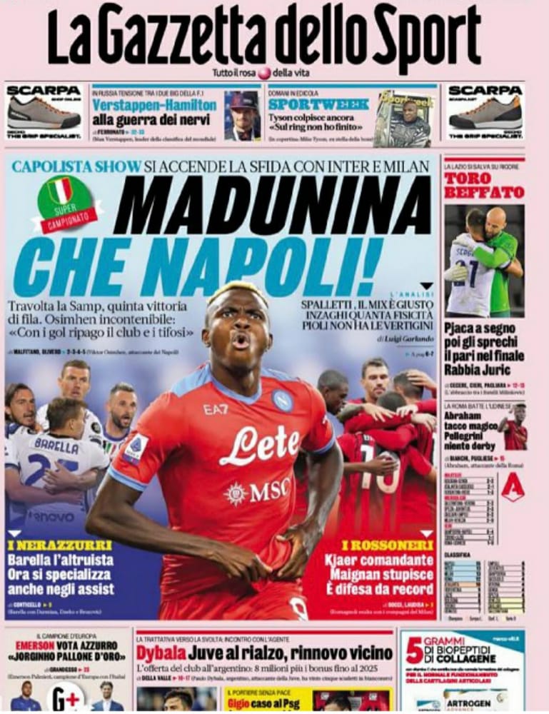 أبرزت الصحيفة الإيطالية في غلافها تصدر نابولي لترتيب الدوري الإيطالي في الوقت الحالي، بعد النتائج الخيالية التي يقدمها الفريق تحت عنوان مادونينا تشي نابولي.