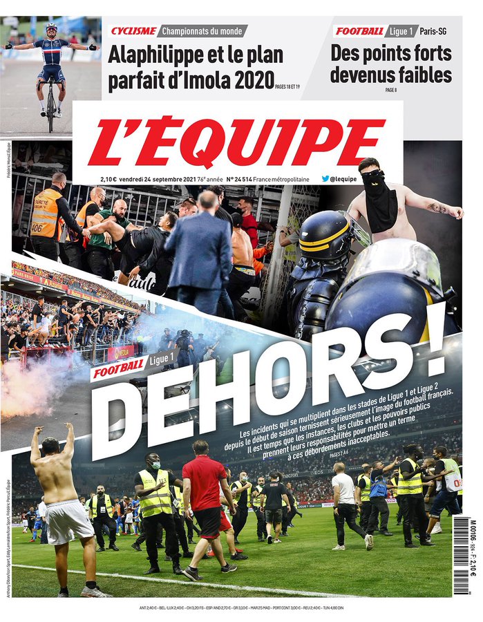 تصدرت أحداث الشغب في ملاعب الكرة الفرنسية غلاف صحيفة ليكيب الصادر عن اليوم الجمعة، وذلك تحت عنوان إلى الخارج، وذلك بمنع أصحاب الشغب في الملاعب من دخول المباريات بعد تعليمات وزارة الرياضة الفرنسية.
