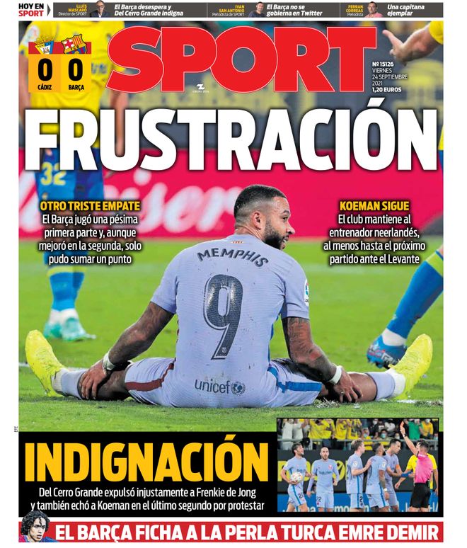 عنونت صحيفة سبورت الكتالونية في غلافها تحت عنوان إحباط.. كومان سيستمر، في إشارة نحو التطورات الأخيرة، بشأن موقف الفريق الكتالوني بعد حالة التراجع الأخيرة.