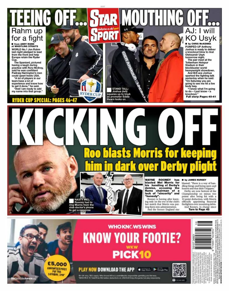 ركزت صحيفة ديلي ستار الإنجليزية في غلافها على أزمة روني مع فريق ديربي كاونتي الأخيرة، وذلك تحت عنوان هجوم، في إشارة إلى أن روني في أزمة بعد عدم إخباره عن معلومات بشأن مستقبل النادي.