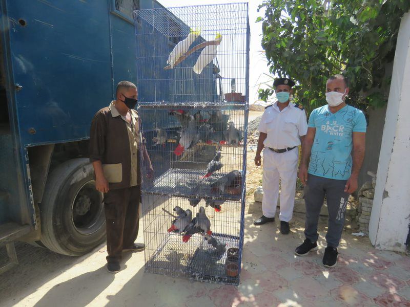 ضبط 2 مأوى عشوائي غير مرخص لتربية الحيوانات والطيور البرية المهددة بالانقراض والاتجار فيها داخل مزرعتين كائنتين بدائرة قسم شرطة ثان الشيخ زايد بالجيزة، كما تم ضبط شخصين يعملان بالمزرعتين المشار إليهما وقد بلغ إجمالي المضبوطات 55 ببغاء و16 قرد و23 سلحفاة جميعها مجهولة المصدر مهربة ومهددة بالانقراض ومحظور الإمساك أو الاتجار بها وغير محصنة بيطريًا، و4 محنطات حيوانية، ولقد تم إيداع الحيوانات بإحدى الجهات المختصة لرعايتها.
