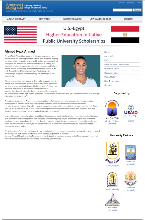 واصل أحمد حديثه أن العالم أو العبقري هو من يخترق حجاب المألوف، حيث استطاع رزق استغلال المنحة لتحقيق أحلامه التي لن تنتهي، وتم حصوله على قصتي نجاح من قبل الوكالة الأمريكية للتنمية الدولية، لسنتي 2016 و2021، وتتواصل معه الوكالة حاليًا ليحصل على قصة النجاح الثالثة، بمناسبة مشروع تخرجه، والذي كان تصميم جهاز محمول للغسيل الكلوي، ويكون هذا الجهاز الأول من نوعه في الشرق الأوسط، وبعد تخرجه يعمل الأن مهندس لدى الشركة العربية للهندسة الطبية.