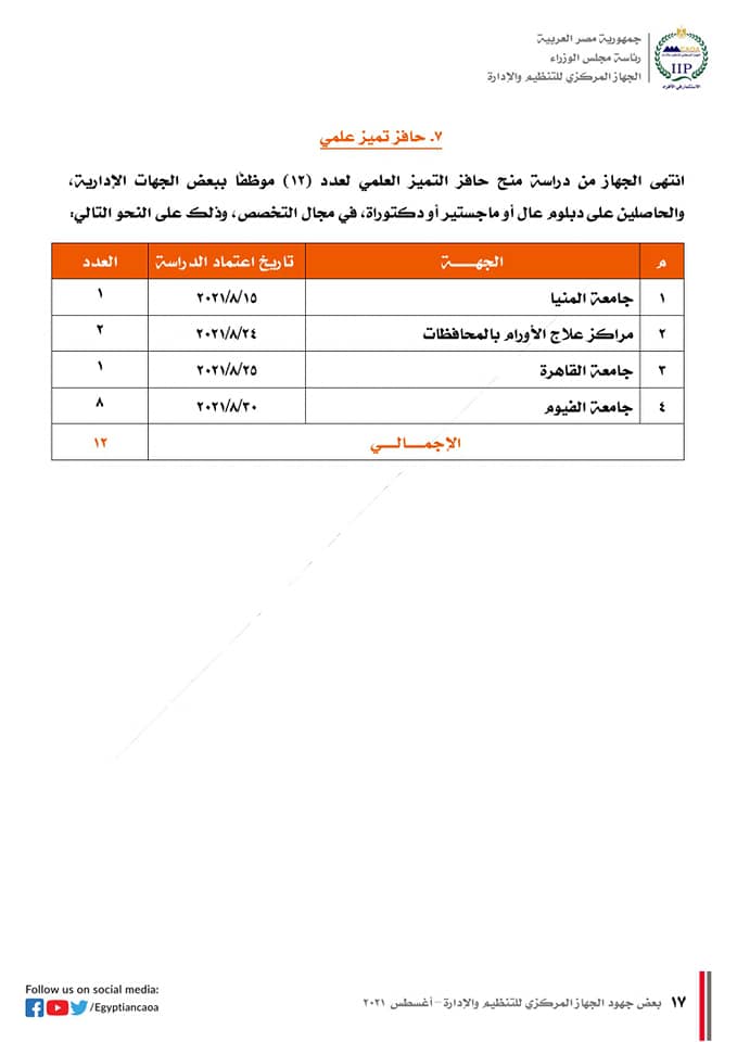 انتهى الجهاز المركزي للتنظيم والإدارة، برئاسة الدكتور صالح الشيخ، من دراسة منح حافز التميز العلمي لـ 12 موظفا ببعض الجهات الإدارية، والحاصلين على دبلوم عال أو ماجستير أو دكتوراه، وذلك في مجال التخصص.