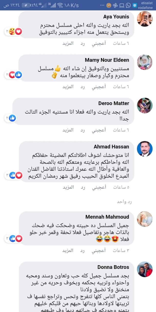وكانت تعليقات الجمهور تدل على افتقادهم للمسلسل وفرحتهم البالغة بقرب عرضه حيث علقت إحدى متابعات الفنان سيد رجب: «يافرحة قلبي بالخبر العظيم ده»، وعلق متابع أخر: «شكلنا هنشوف عظمة السنة دي »، وعلقت أخرى:«منتظرين وبالتوفيق إن شاء الله، مسلسل محترم وكبار وصغار يتعلمون منه».