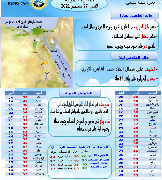 تنشط رياح شمالية غربية على السواحل الشمالية وجنوب سيناء وجنوب الصعيد على فترات متقطعة، تتراوح سرعتها ما بين 12: 17 عقدة/الساعة.