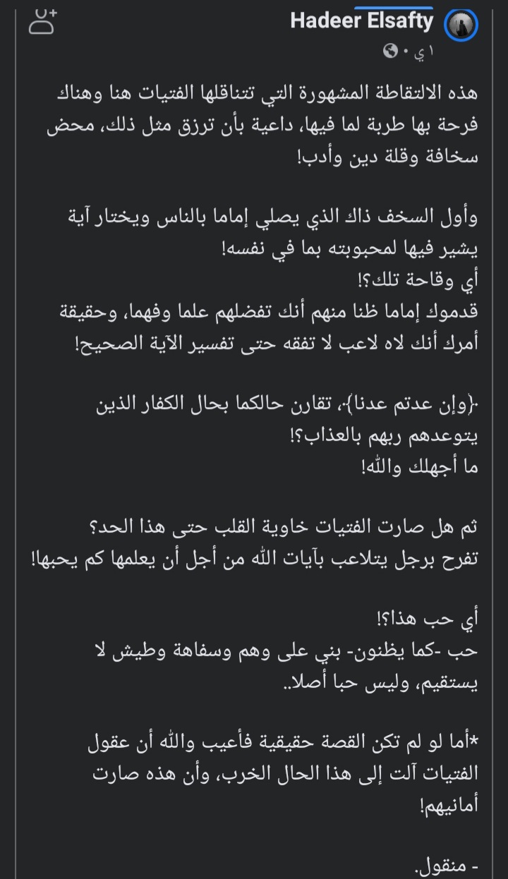 كما عبر الكثير من مستخدمي مواقع التواصل الاجتماعي عن سخطهم كذلك مما فعله هذا الشاب، متناقلين فيما بينهم منشورات يأتي في نصها: هل صارت الفتيات خاوية القلب حتى هذا الحد؟.. تفرح برجل يتلاعب بآيات الله من أجل أن يعلمها كم يحبها!