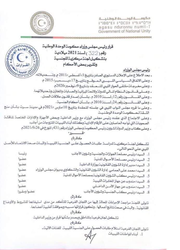 قرر عبد الحميد الدبيبة، رئيس حكومة الوحدة الوطنية الليبية، تشكيل لجنة مركزية لدراسة طلبات الحصول على الجنسية الليبية، واثبات صحة الانتماء للأصل