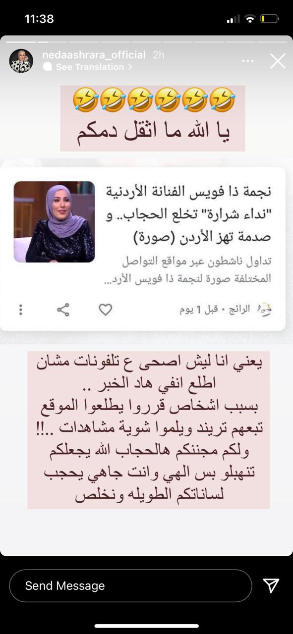 يشار إلى أن نداء شرارة نشرت صورة من هذه الأخبار، عبر ستوري لها على حسابها الشخصي بموقع تبادل الصور والفيديوهات الشهيرة انستجرام، وعلقت عليها قائلة: يا الله ما أثقل دمكم.
