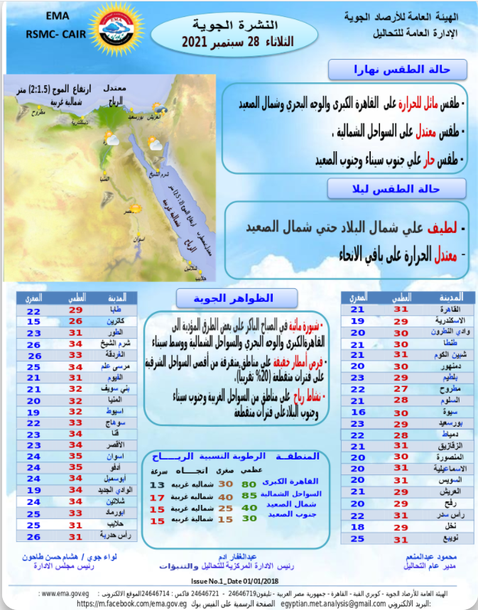 كما أعلنت هيئة الأرصاد الظواهر الجوية المتوقع حدوثها غدًا الثلاثاء، حيث تشير إلى استمرار تكّون الشبورة المائية في الصباح الباكر على الطرق القريبة من المسطحات المائية والمؤدية إلى القاهرة والوجه البحري والسواحل الشمالية ووسط شبه جزيرة سيناء.