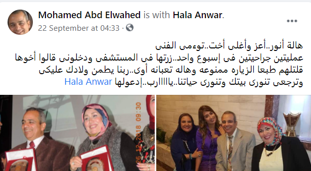 أضاف محمد عبد الواحد: الزيارة ممنوعة وهالة تعبانة أوي.. ربنا يطمن ولادك عليكي.. وترجعي تنوري بيتك وتنوري حياتنا.. يا رب ادعولها.