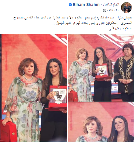 ونشرت الفنانة إلهام شاهين صورا لها بصحبة الفنانة دنيا سمير غانم والدكتورة إيناس عبد الدايم على المسرح من لحظة التكريم عبر صفحتها الرسمية على موقع فيس بوك وعلقت عليها قائلة: حبيبتي دنيا، مبروك تكريم اسم سمير غانم ودلال عبد العزيز من المهرجان القومي للمسرح المصري، ستكونين أنتِ وإيمي امتداد لهم في فنهم الجميل، بحبكم من كل قلبي.