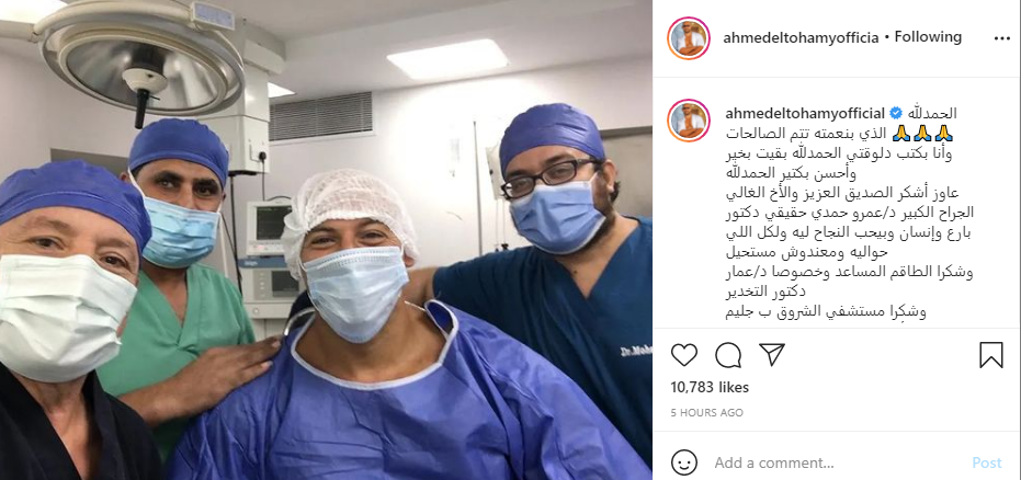 نشر الفنان أحمد التهامي صورة له بعد خروجه من غرفة العمليات رفقة طاقم الفريق الطبي، عبر صفحته الرسمية على موقع انستجرام، وكتب عليها قائلًا: الحمد لله الذي بنعمته تتم الصالحات.. وأنا بكتب دلوقتي.. الحمد لله بقيت بخير وأحسن بكتير الحمد لله.