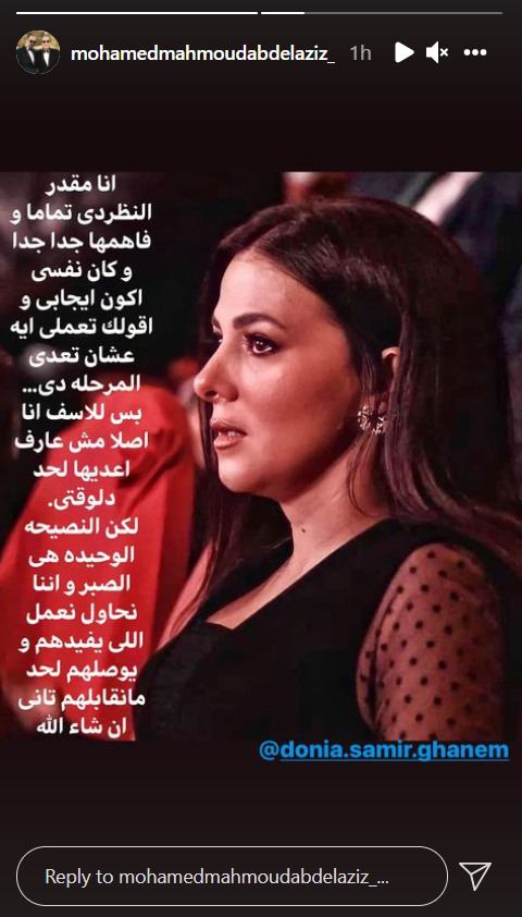 ونشر محمد محمود عبد العزيز صورة لدنيا سمير غانم وهي تبكي، عبر خاصية ستوري على حسابها الشخصي بموقع تبادل الصور والفيديوهات انستجرام، وعلق على الصورة قائلًا: أنا مقدر النظرة دي تماما وفاهمها جدا جدا وكان نفسي أكون إيجابي وأقولك تعملي إيه عشان تعدي المرحلة دي.