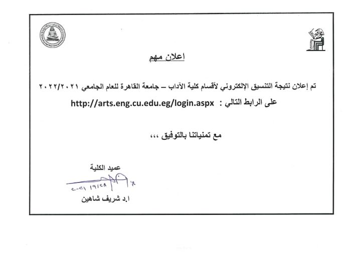 إعلان نتجية التنسيق الإلكتروني لأقسام كلية الآداب جامعة القاهرة