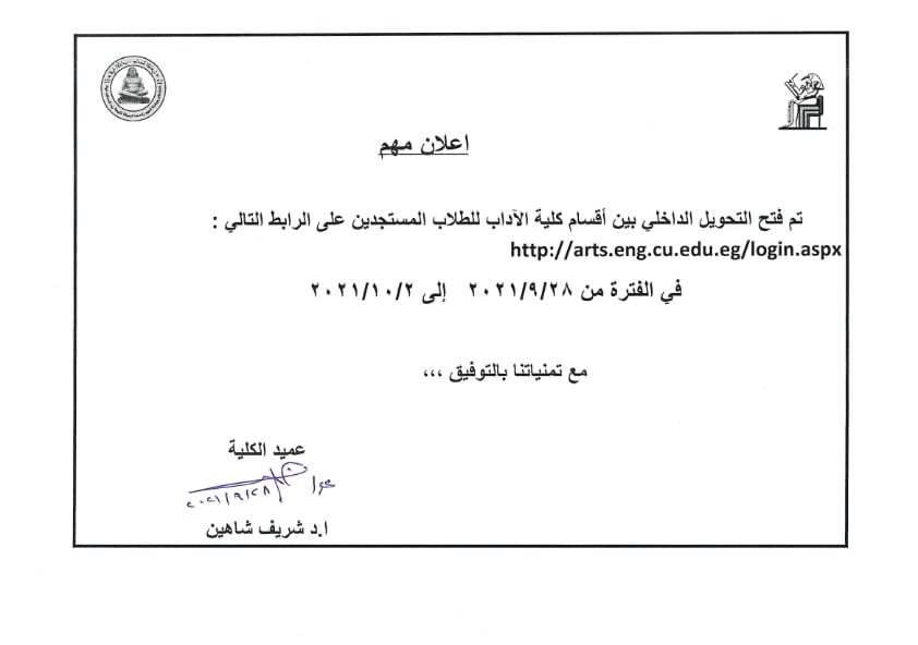 كما أعلنت الكلية عملية التحويل الإلكتروني بين أقسام الكلية، لطلاب الثانوية العامة الملتحقين بالكلية في العام 2021، مشيرة إلى أن عملية التحويل تتم إلكترونيا من خلال الدخول على الرابط التالي، وذلك في الفترة من 28/9/2021 إلى 2/10/2021.