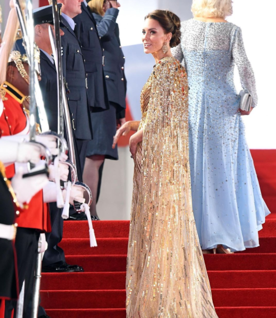 وظهرت كيت ميدلتون بإطلالة جذابة مرتدية فستان باللون الذهبي، واختارت مكياج خفيف يبرز جمال ملامحها وذلك على السجادة الحمراء بصحبة الأمير ويليام، مشيدًا بالعمل بشكل كبير.