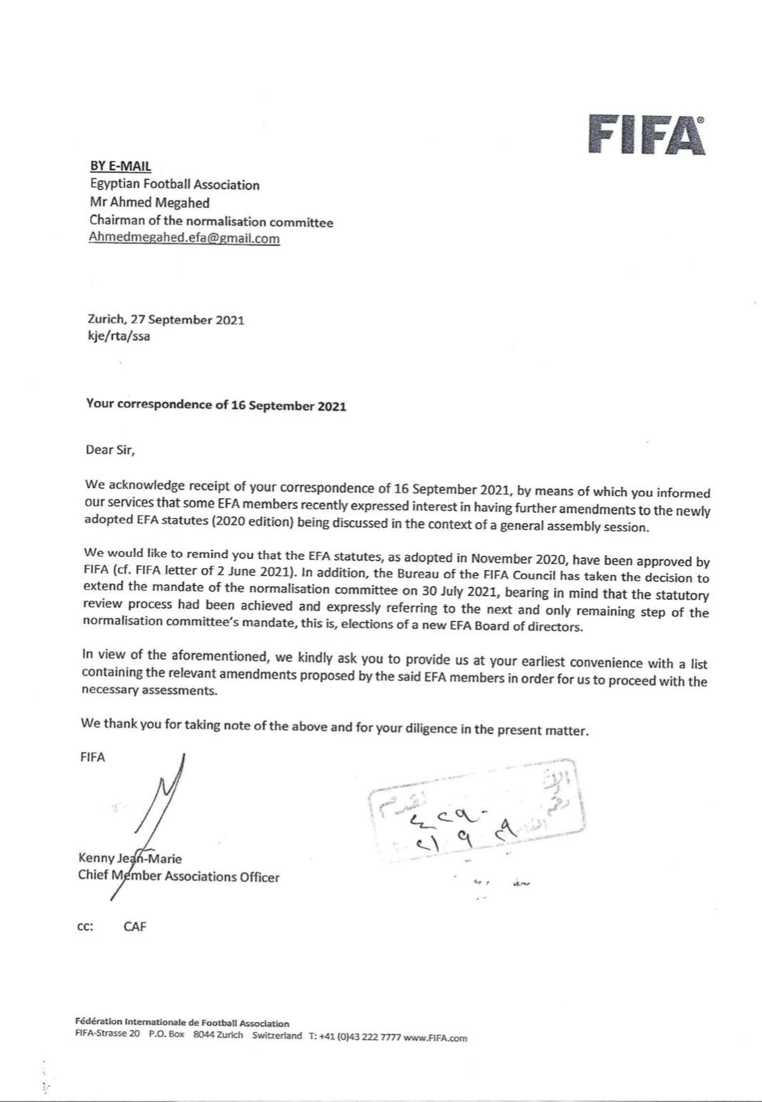 أرسل الاتحاد المصري لكرة القدم برئاسة أحمد مجاهد إلى الأندية الأعضاء بالجمعية العمومية للاتحاد يطلب فيه موافاته بالتعديلات المقترحة على لائحة النظام الأساسي للعرض على الاتحاد الدولي لكرة القدم فيفا حسب طلبه.