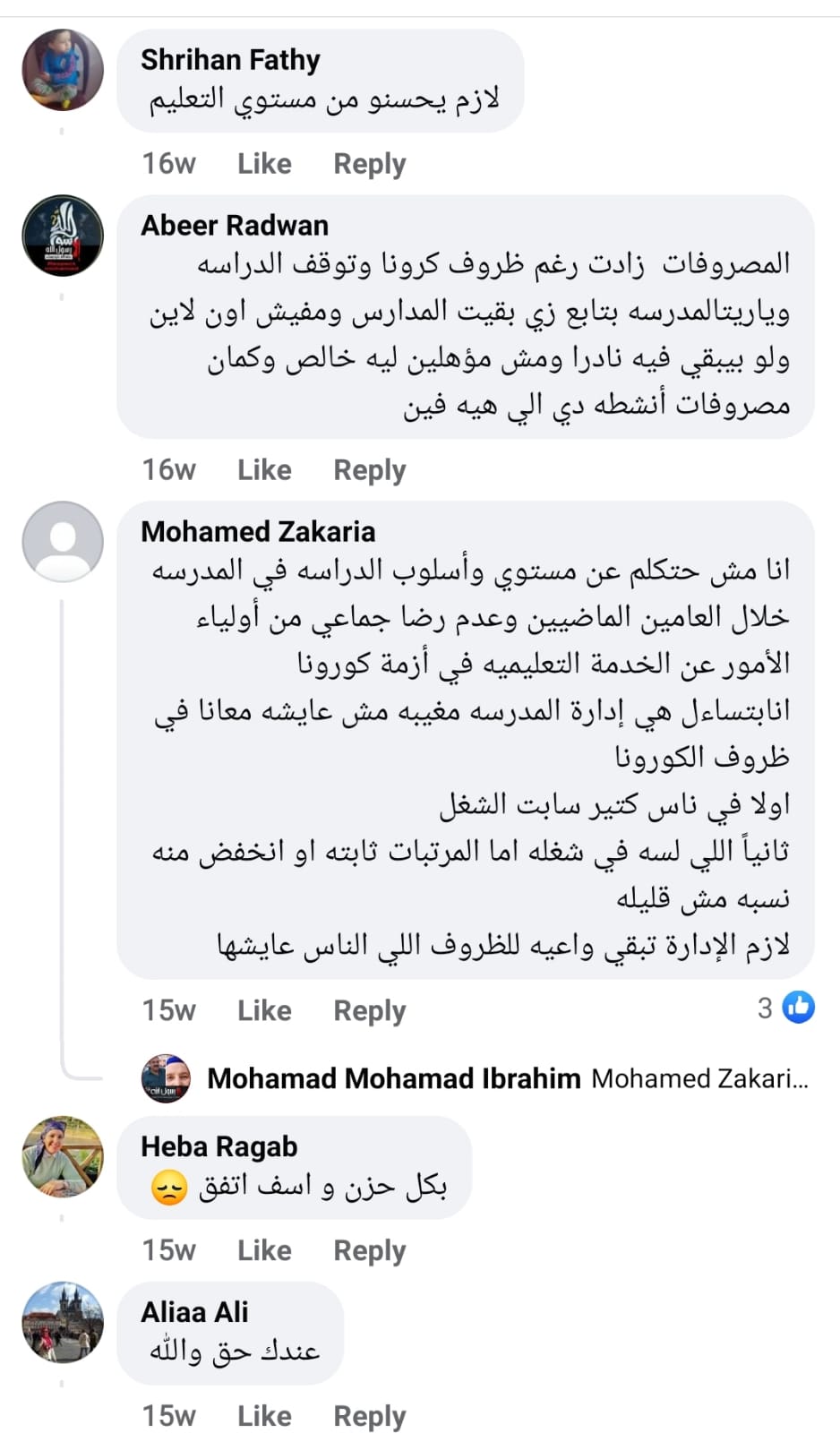 وعلقت سارة النادي، ولي أمر لطالبة بالمدرسة، على منشور بجروب ائتلاف أولياء أمور مصر، قائلة: المواعيد صعبة جدا من وقت حجة الكوبرى لما ابتدائي تخرج الساعة 1 وهما محتاجين تأسيس وشغل أساسًا، حاجة تانية ليه المصاريف المتزايدة كل شوية بشكل مش منطقي وما فيش خدمة مقدمة قصادها، ولا حتى في زووم كلاس، وفعلا المدرسة محتاجة تطوير للأبنية بتاعتها والفصول واهتمام بالحمامات أكتر من كدة.