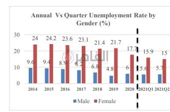 وأشارت مذكرة البطالة إلى ارتفاع القوى العاملة من الذكور بشكل طفيف في الربع الثاني من عام 2021 مقارنة بالربع الأول من عام 2021 بنسبة 0.19٪.