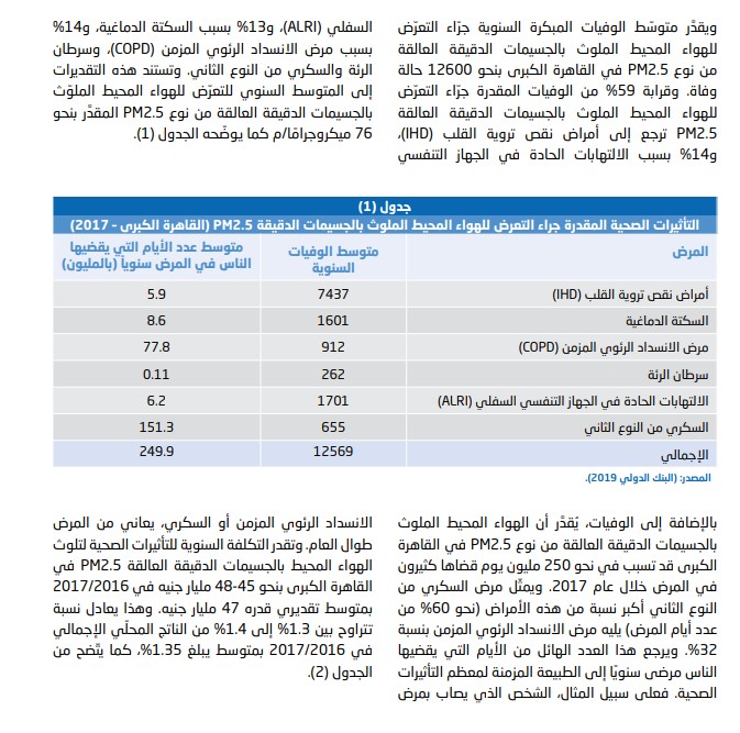 وأوضح التقرير أن التكلفة السنوية للتأثيرات الصحية لتلوث الهواء المحيط بالجسيمات الدقيقة العالقة في القاهرة الكبرى بنحو 45 إلى 48 مليار جنيه في 2016 / 2017 بمتوسط تقديري قدره 47 مليار جنيه، وهذا يعادل نسبة تتراوح بين 1.3 % إلى 1.4 % من الناتج المحلي الإجمالي في 2016 / 2017.