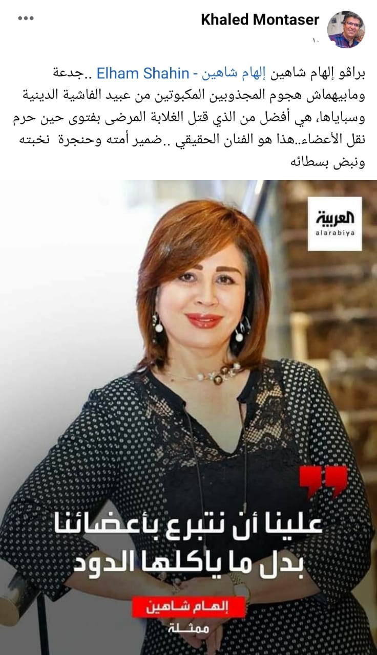 وكتب خالد منتصر منشورًا، عبر حسابه الشخصي بموقع التواصل الاجتماعي في بوك، قائلًا: «برافوا إلهام شاهين.. جدعة وماببيهماش هجوم المجذوبين المكبوتين من عبيد الفاشية الدينية وسباياها، هي أفضل من الذي قتل الغلابة المرضى، بفتوى حين حرم نقل الأعضاء، هذا هو الفنان الحقيقي، ضمير أمته وحنجرة نخبته ونبض بسطائه».
