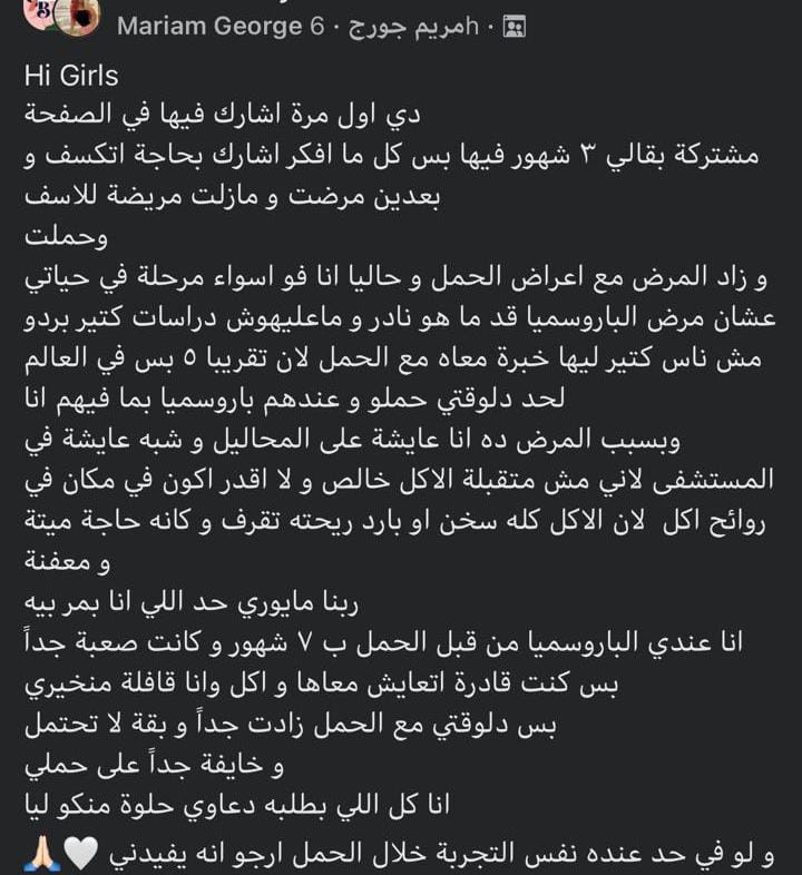 وكتبت مريم في منشور لها بموقع التواصل الاجتماعي فيس بوك: مشتركة في الصفحة بقالي 3 شهور وكل ما أشارك بحاجة أتكسف، وبعدين مرضت وما زلت مريضة للأسف، وحملت وزاد المرض مع أعراض الحمل، وحاليًا أنا في أسوأ مرحلة في حياتي.