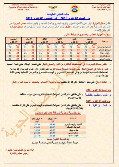 أصدرت الهيئة العامة للأرصاد الجوية بيانًا توضيحيًا لحالة الطقس وأبرز الظواهر الجوية المتوقع حدوثها خلال الأسبوع الجاري اعتبارًا من غدٍ الأحد وحتى الخميس المقبل الموافق 7 أكتوبر.