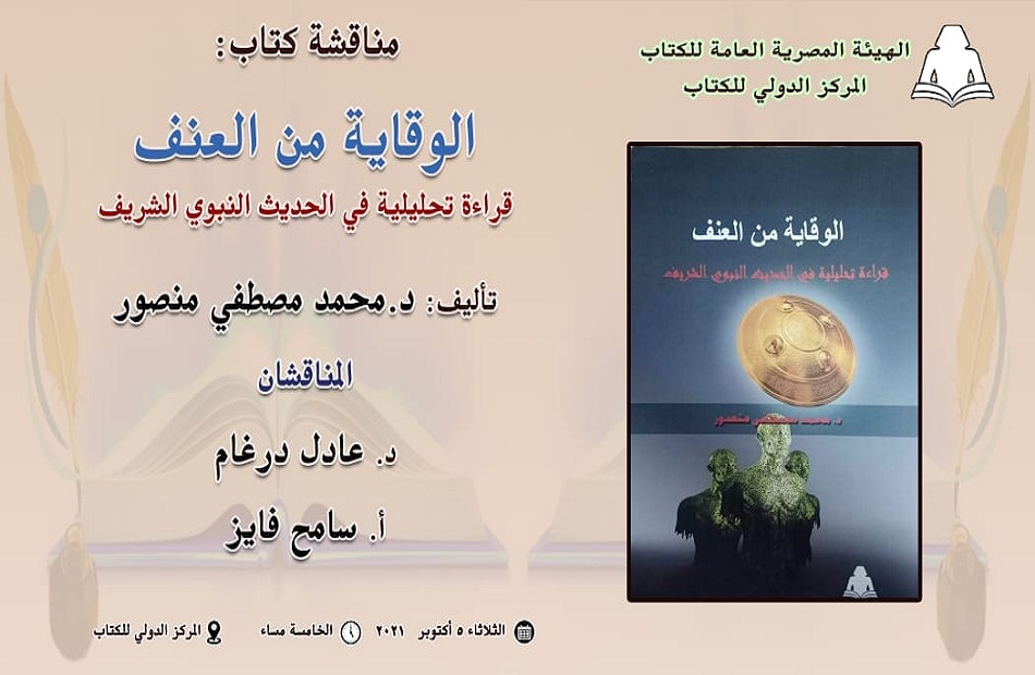 يعقد المركز الدولي للكتاب، التابع للهيئة العامة للكتاب، ندوة مناقشة كتاب الوقاية من العنف - قراءة تحليلية في الحديث النبوي الشريف، وهو من تأليف الدكتور محمد مصطفى منصور أستاذ الأدب العربي بكلية دار العلوم جامعة القاهرة فرع الفيوم، وذلك في الخامسة من مساء الثلاثاء المقبل 5 أكتوبر 2021 بمقر المركز خلف دار القضاء العالي.