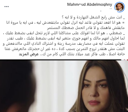 وكتب الفنان محمود عبد المغني منشورًا، عبر حسابه الشخصي بموقع التواصل الاجتماعي فيس بوك، حيث نشر حوارًا درامي، بينه وبين زوجته التي تُدعى مروة، التي تجسد شخصيتها وجه القمر دينا فؤاد.