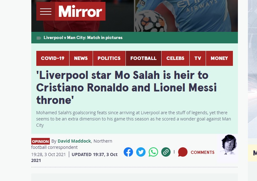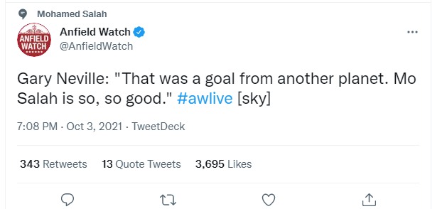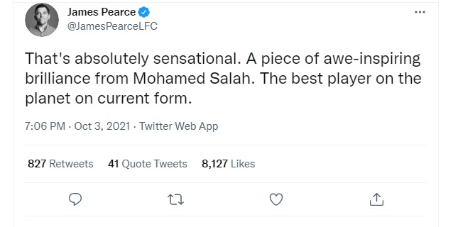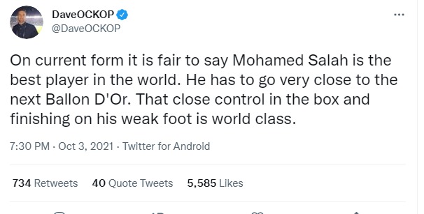 كتب على حسابه الرسمي على موقع تويتر: في الوقت الحالي، من العدل أن نقول أن محمد صلاح هو أفضل لاعب في العالم، هو قريب من الكرة الذهبية التالية، هذا التحكم الدقيق في منطقة الجزاء والإنهاء بقدمه الضعيفة هو من الطراز العالمي.