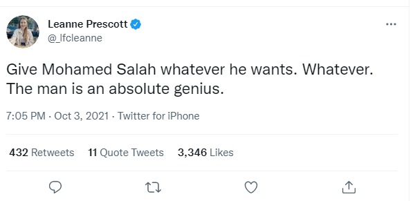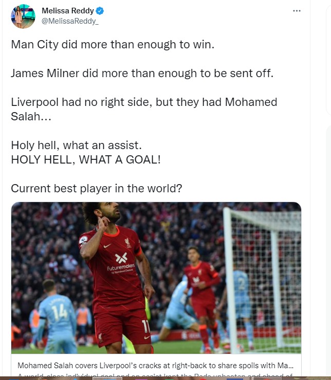 كتبت على حسابها الرسمي لموقع التواصل الاجتماعي تويتر: لم يكن لليفربول الجانب الأيمن، لكن كان لديهم محمد صلاح، الجحيم المقدس، يا لها من مساعدة ويا له من هدف! أفضل لاعب حالي في العالم.