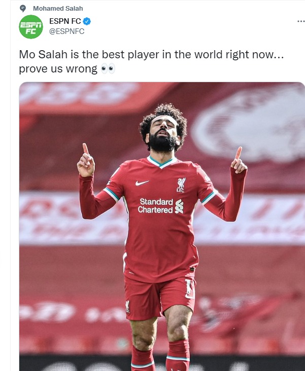 الصفحة الرسمية لــ ESPN FC التابعة للشبكة العالمية والمختصة في تغطية كرة القدم حول العالم نشرت صورة محمد صلاح وعلقت عليها: محمد صلاح أفضل لاعب في العالم الآن.. أثبت خطأنا.