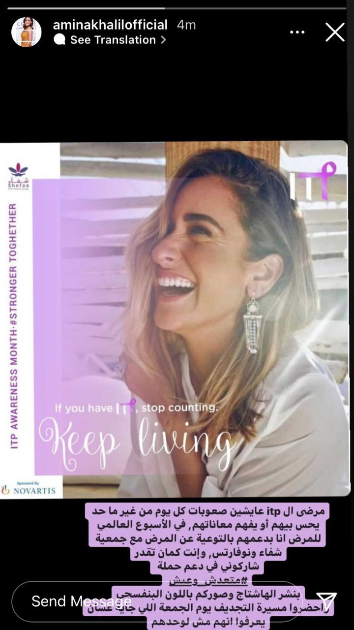 ووضحت الفنانة أمينة خليل دعمها للمرضى قائلة: مرضى الـ ITP عايشين صعوبات كل يوم من غير ما حد يحس بيهم أو يفهم معاناتهم، داعية متابعي صفحتها الشخصية بإظهار دعمهم المعنوي للمرضى والتوعية بالمرض.