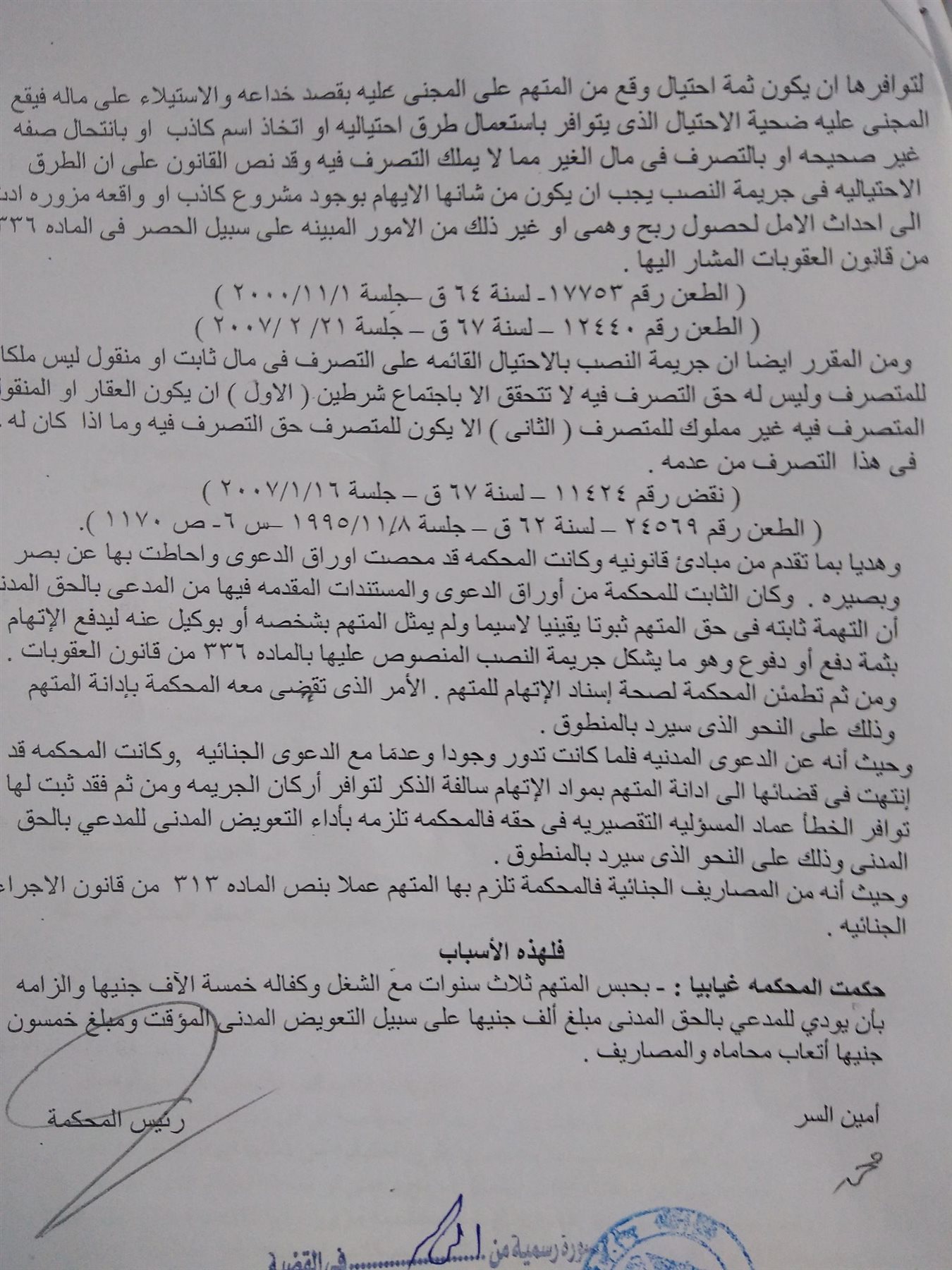وصدر ضد رجل الأعمال المرشح حكمًا بالسجن 3 سنوات، في الدعوى القضائية المقامة من م ز، وهي الدعوى التي اتهمه فيها باستعمال طرق احتيالية للاستيلاء على مبلغ مالي مليون و132 ألف جنيه، أوهمه بعدة أمور وتعاملات، وهي أنه عضو مجلس إدارة بشركة شهيرة للطاقة والخدمات البترولية، وأنه سيدخل المجني عليه كشريك معه في الحصول على عقد إيجار لقطعة أرض لإنشاء محطة بنزين عليها، وأنه سيمنحه توكيل زيوت من شركة شهيرة لمحافظة سوهاج، وأنه أعد له سيارة لتوزيع الزيوت، وأن شركة ماسي ستبيع له تلك السيارة، وأوهمه أنه سينشأ له شركة مساهمة تدعى بروج مصر للطاقة والخدمات البترولية، وأنه سيسهل له الإجراءات عن طريق علاقاته بشخصيات هامة بالدولة، واتخذ المتهم من الأفعال المادية ما يجعل المجني عليه يعتقد بصحة أقواله.