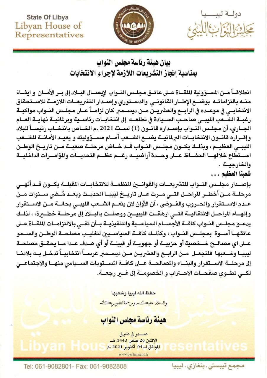 وقالت هيئة رئاسة مجلس النواب في بيان لها، إنه على كافة الأجسام السياسية والتنفيذية بأن تفي بالالتزامات الملقاة على عاتقها أسوة بمجلس النواب.