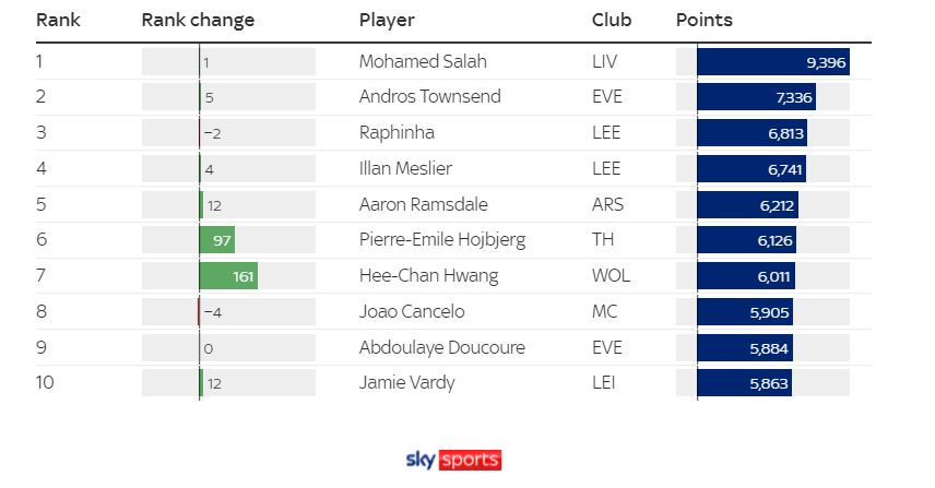 احتل الدولي المصري محمد صلاح، نجم فريق ليفربول الإنجليزي، صدارة تصنيف نجوم الدوري الإنجليزي الممتاز، في الــ5 جولات الأخيرة من المسابقة، وفق تصنيف شبكة سكاي سبورت البريطانية.