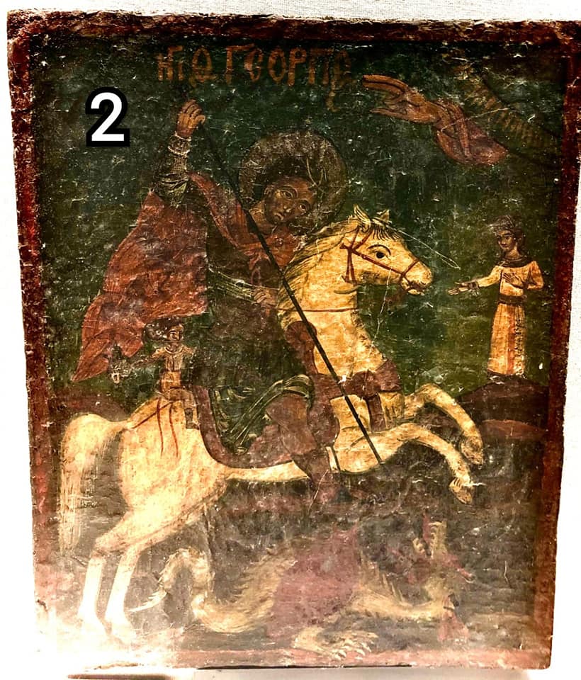 - أيقونة تمثل القديس مار جرجس في زيه العسكري، يمتطي جواده الأبيض ويمسك الحربة يقتل بها تنينًا،بينما في اليد الأخرى يحمل المقاليد، والأيقونة تعبر عن واحدة من معجزات القديس وإنتصاره على الشرور، ومصنوعة من الخشب وتعود إلى العصر القبطي.