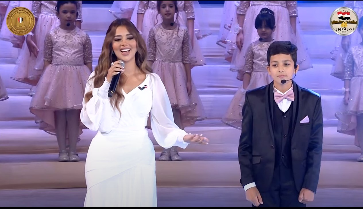 الإماراتية بلقيس وتامر حسني يشاركان في أوبريت كمل عبورك بحضور السيسي
