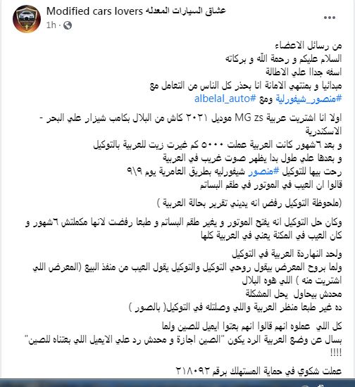 ونشرت صفحة عشاق السيارات المعدلة، عبر موقع التواصل الاجتماعي فيس بوك، شكاوى لأحد الأعضاء تحذر جميع المواطنين من التعامل مع شركة منصور شيفروليه مع معرض البلال أوتو.