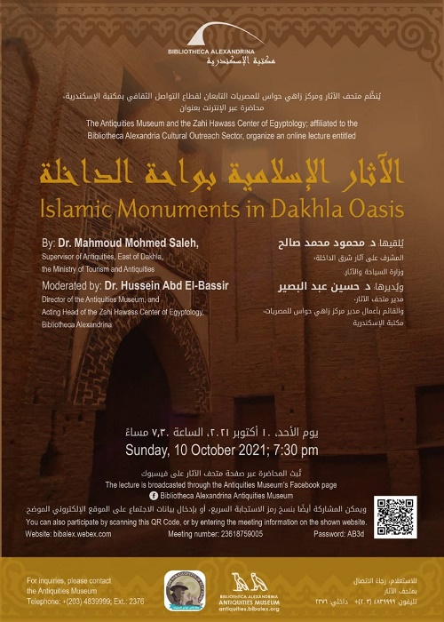 تعقد مكتبة الإسكندرية محاضرة ستُبث عبر الإنترنت بعنوان «الآثار الإسلامية بواحة الداخلة»، يُلقيها الدكتور محمود محمد صالح أحمد، المشرف على آثار شرق الداخلة بوزارة السياحة والآثار، وذلك يوم الأحد الموافق 10 أكتوبر 2021، الساعة السابعة والنصف مساءً، عبر صفحة متحف الآثار على فيسبوك «Bibliotheca Alexandrina Antiquities Museum».