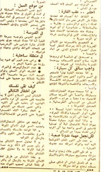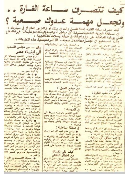 بعد أن لجأ العدو الغادر إلى ضرب الأهداف المدنية في بورسعيد، ودمشق، وحمص تأكد من تنفيذ إجراءات الدفاع المدني وإرشاداته كافة.. لذا ترجو إدارة العلاقات العامة بوزارة الداخلية من المواطنين اتباع التعليمات الآتية:-