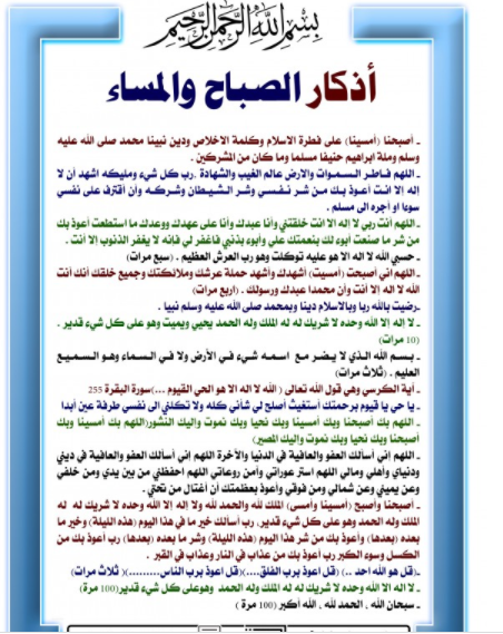 1-« أَصْبَحْنا وَأَصْبَحَ المُلْكُ لله، وَالحَمدُ لله، لا إلهَ إلاّ الله وَحدَهُ لا شَريكَ لهُ، لهُ المُلكُ، ولهُ الحَمْد، وهُوَ على كلّ شَيءٍ قدير، رَبِّ أسْأَلُكَ خَيرَ ما في هذا اليوم، وَخَيرَ ما بَعْدَه، وَأَعوذُ بِكَ مِنْ شَرِّ ما في هذا اليوم، وَشَرِّ ما بَعْدَه، رَبِّ أَعوذُ بِكَ مِنَ الْكَسَلِ، وَسوءِ الْكِبَر، رَبِّ أَعوذُ بِكَ مِنْ عَذابٍ في النّارِ، وَعَذابٍ في القَبْر».