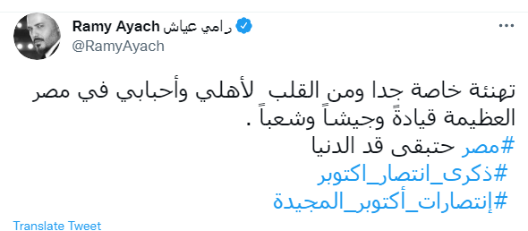 وكتب رامي عياش تغريدة، عبر حسابه الشخصي بموقع التدوينات القصيرة تويتر، مغردًا: «تهنئة خاصة جدًا ومن القلب لأهلي وأحبابي في مصر العظيمة، قيادة وجيشًا وشعبًا، مصر هتبقى قد الدنيا.. ذكرى انتصارات أكتوبر المجيدة.